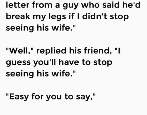 His friend raised an eyebrow, thought about it for a moment, and said, “Well… I guess you’ll just have to stop seeing his wife.”